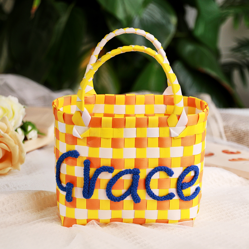Elevate your summer style with this Custom Name Handbag, a beautifully handcrafted plastic woven basket that blends fresh colors with functional design. Personalize it with a name to create a unique and thoughtful gift or a chic accessory just for you.
