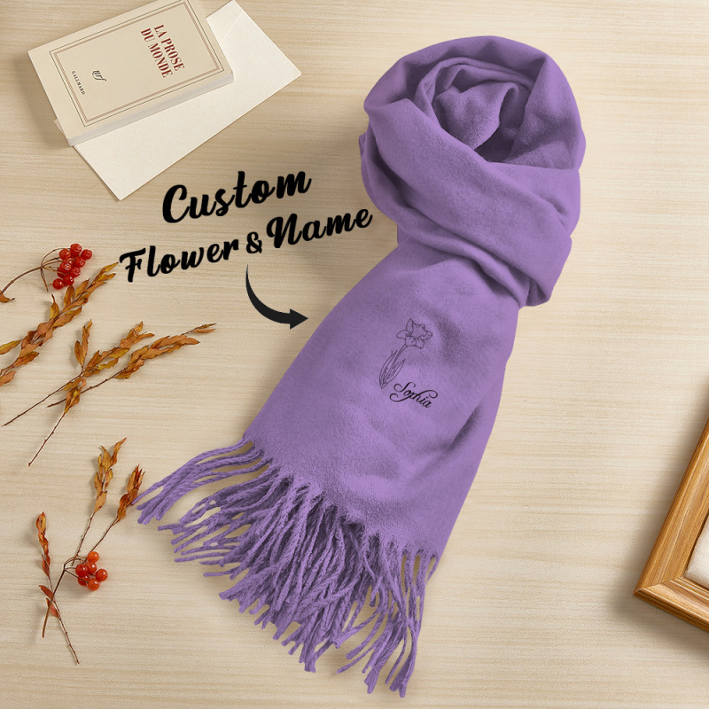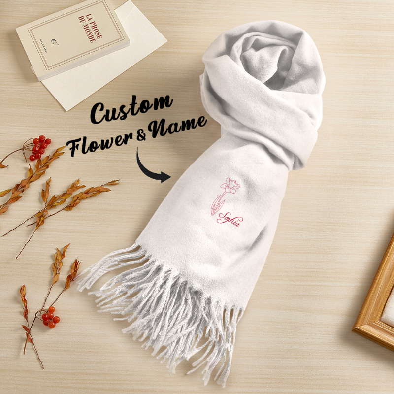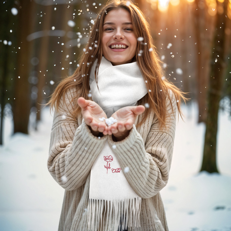 - Personalized Embroidery: Customize each scarf with a delicate embroidered birth flower and meaningful text (name, date, or short message).