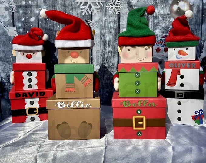 Personalised Christmas stacking boxes, 3 piece set(Christmas hats not included). Perfect for a Christmas eve box, or for treats and goodies on Christmas Day.