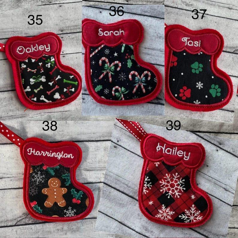 Stocking Ornament the perfect size for gift cards, money, candy or small gifts. Personalized with the name of your choice. Many fabrics to choose from. Embroidered and appliqued for quality and durability.