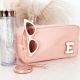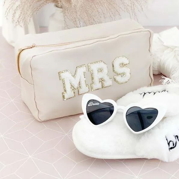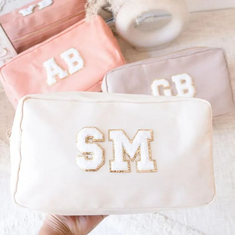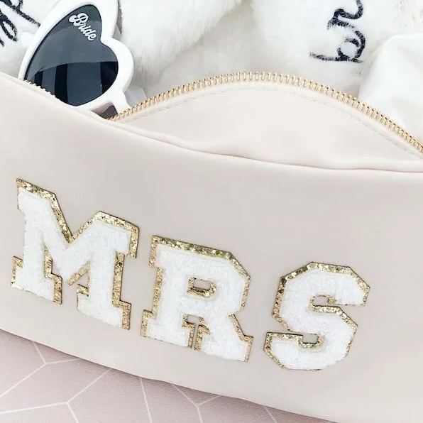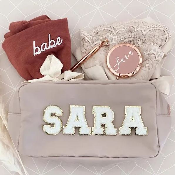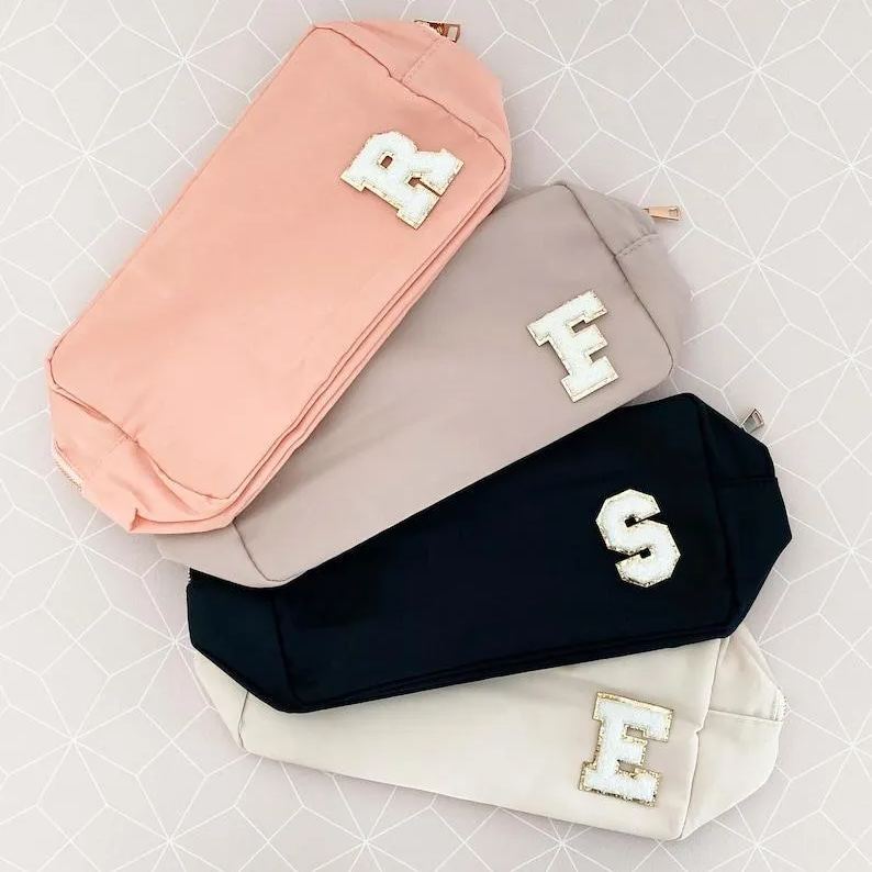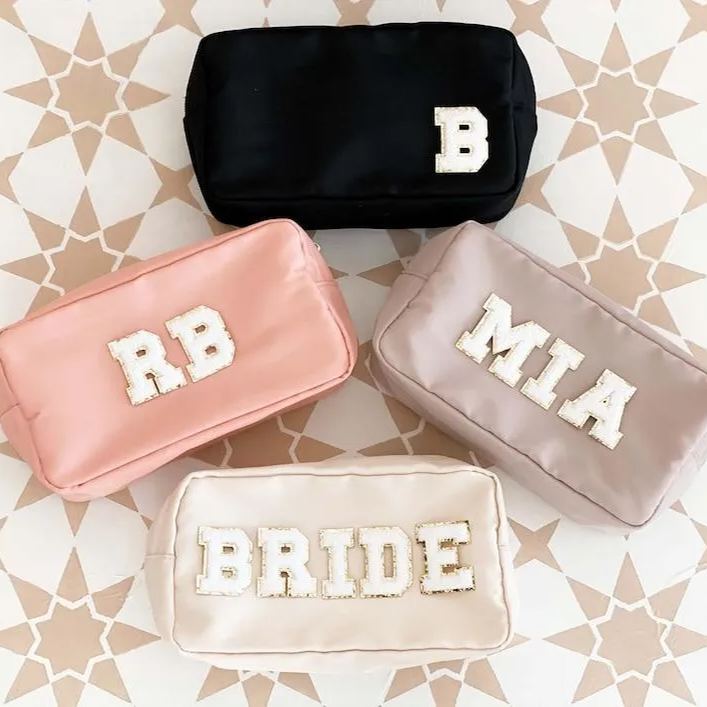 Custom nylon pouches are a great gift for the bride-to-be, bridesmaids, bachelorettes, or any friend who likes pretty things! Each nylon pouch has a gold zipper and is lettered with chenille patches in the name or letters of your choice. Choose from a Natural, Taupe, Blush, or Black bag.